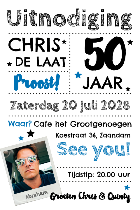 Uitnodiging Abraham met veel vrolijke lettertypes